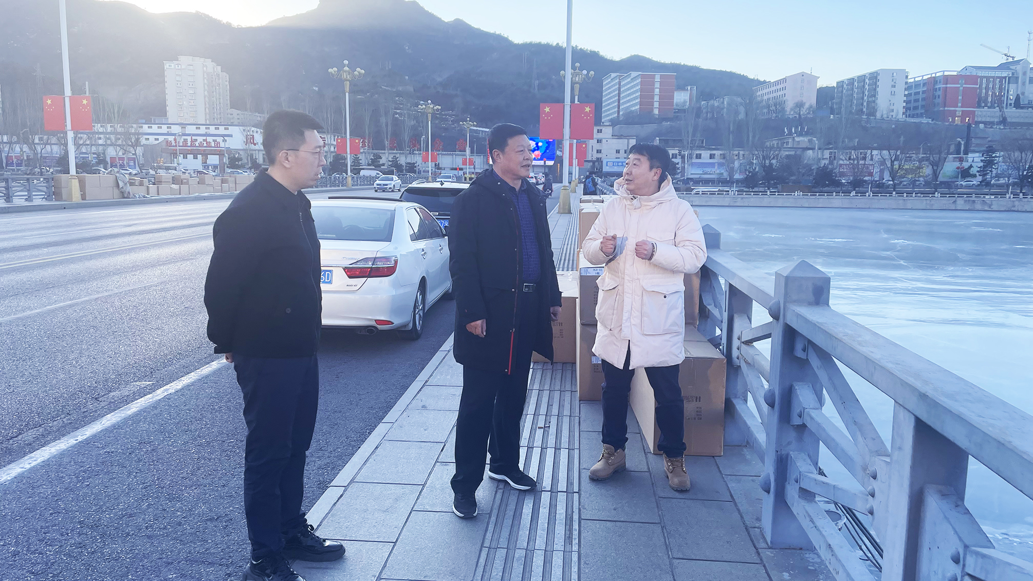 在府前路大橋施工現(xiàn)場,徐俊儒總經(jīng)理聽取了施工單位關(guān)于亮化工程的施工進(jìn)展及疫情防控情況介紹,了解了設(shè)備安裝和材料采購運(yùn)輸情況,查看了工程施工進(jìn)展及相關(guān)安全防護(hù)措施。