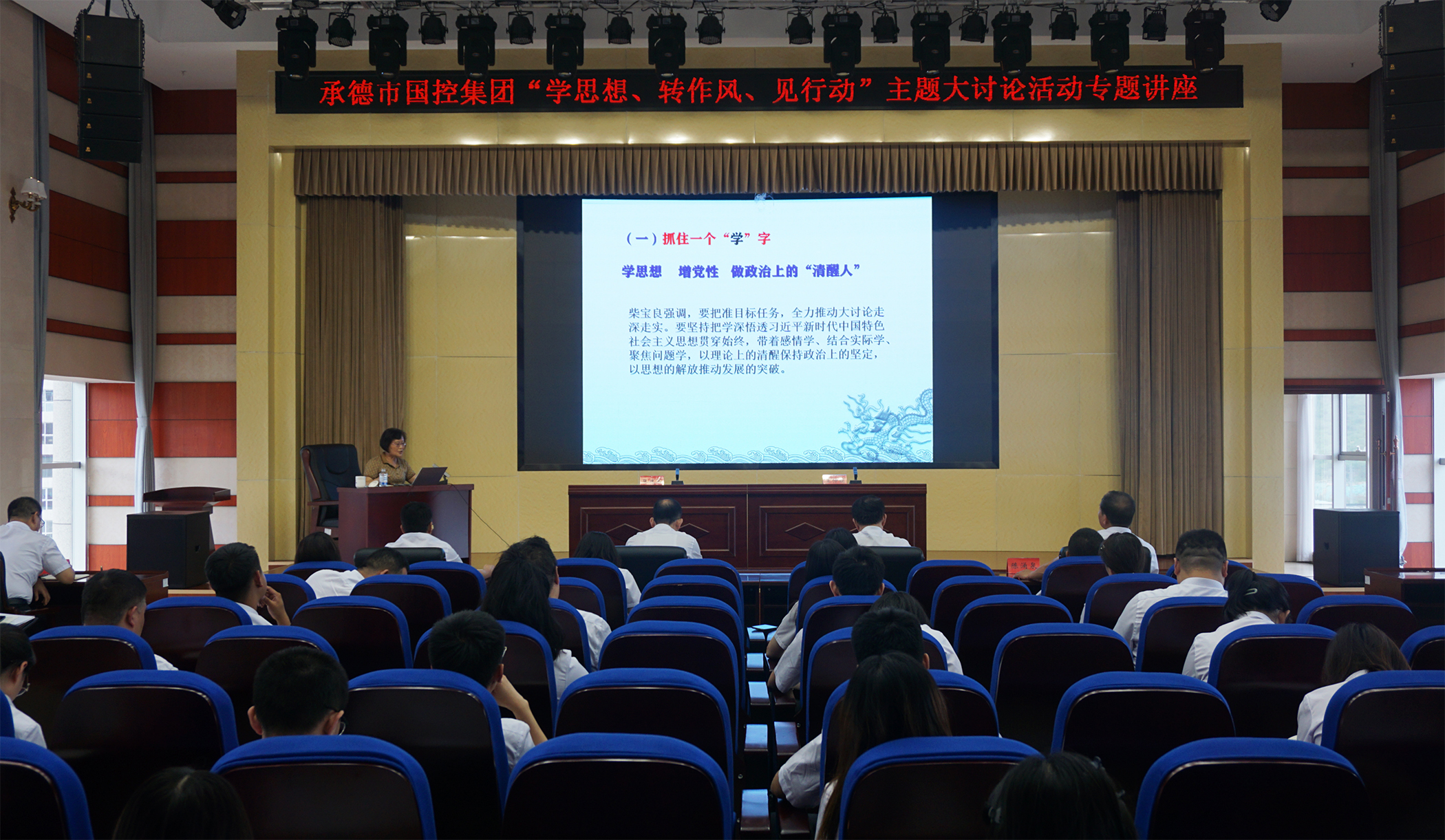 2023年7月6日,為深入學(xué)習(xí)貫徹習(xí)近平總書記關(guān)于堅(jiān)持不懈抓好作風(fēng)建設(shè)的重要論述,落實(shí)市委市政府關(guān)于在全市開展“學(xué)思想、轉(zhuǎn)作風(fēng)、見行動(dòng)”主題大討論活動(dòng)精神,市國(guó)控集團(tuán)邀請(qǐng)承德市委黨校黨史黨建教研室主任王仲娟教授,開展了“學(xué)思想、轉(zhuǎn)作風(fēng)、見行動(dòng)”主題大討論活動(dòng)專題講座,市國(guó)控集團(tuán)領(lǐng)導(dǎo)班子、集團(tuán)本部全體員工、實(shí)際控制子公司中層以上負(fù)責(zé)同志及黨員員工參加講座。