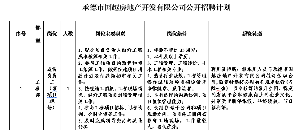本次擬招聘1個(gè)崗位共計(jì)1人。具體應(yīng)聘條件見(jiàn)附件《承德市國(guó)越房地產(chǎn)開(kāi)發(fā)有限公司公開(kāi)招聘計(jì)劃表》 。