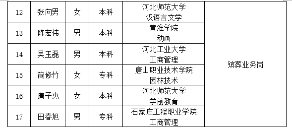 因公司發(fā)展需要,承德市國(guó)瑞置業(yè)有限公司委托第三方機(jī)構(gòu)面向社會(huì)公開招聘殯儀館運(yùn)營(yíng)各崗位人員17名。現(xiàn)對(duì)擬錄用人員信息進(jìn)行公示,公示期間如有異議,可通過電話、信函等方式反映,反映意見請(qǐng)署真實(shí)姓名。