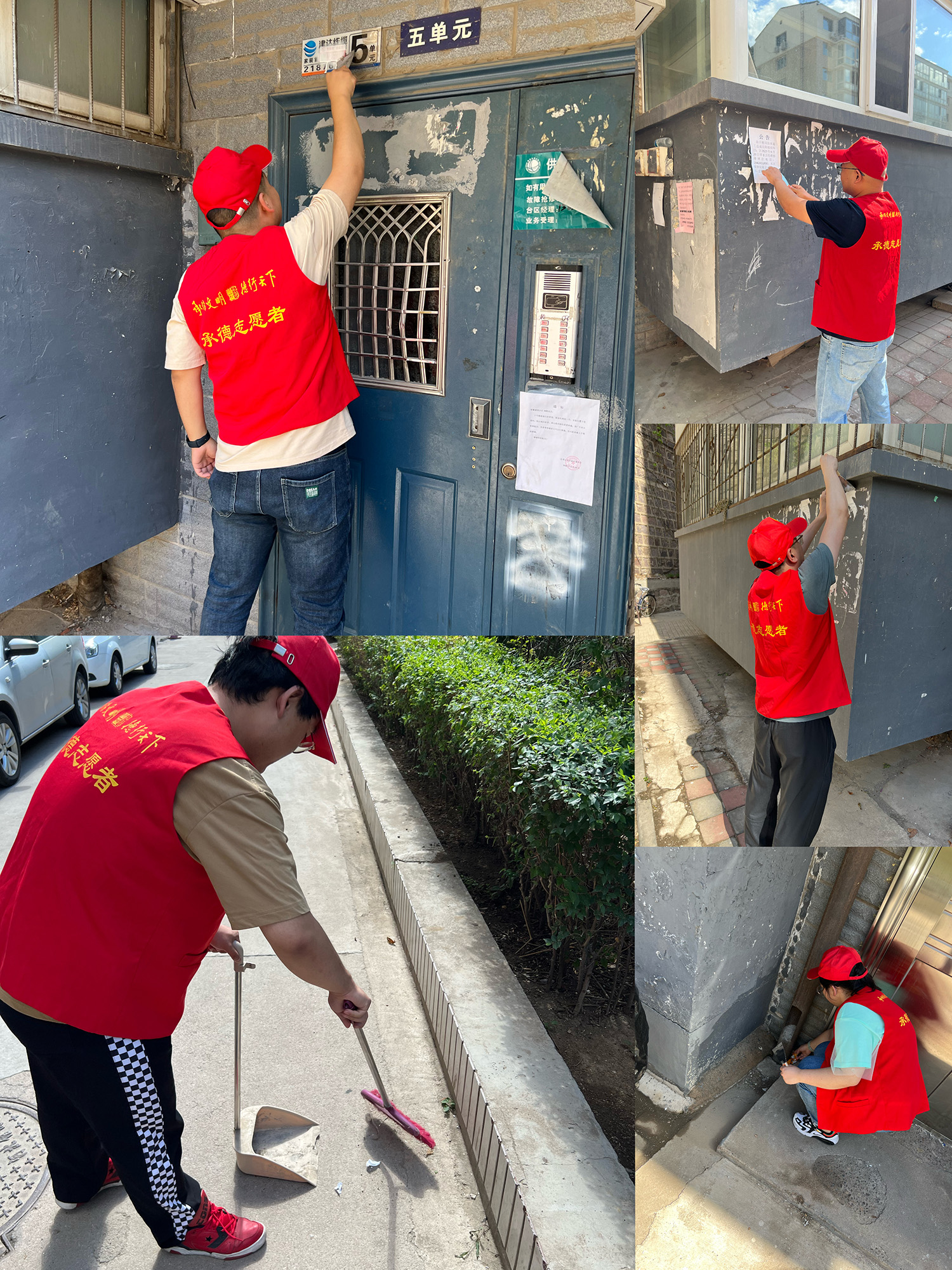 在活動(dòng)現(xiàn)場,大家身穿紅色志愿者馬甲,手持鏟子、掃帚、簸箕等工具,在炎炎夏日中為小區(qū)居民打掃小區(qū)衛(wèi)生,著重清除非法小廣告以及衛(wèi)生死角、亂點(diǎn)。
